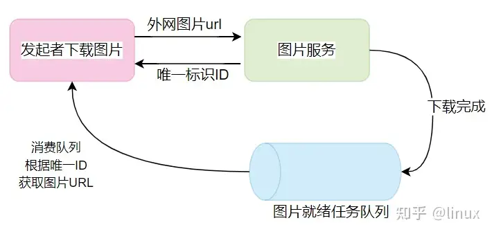 还是以为异步图片下载为例,图片服务中台提供了异步接口,发起者请求之后立即返回,图片服务此时给了发起者一个唯一标识ID,等图片服务完成下载后把结果放到一个消息队列,此时需要发起者不断消费这个MQ才能拿到下载结果。